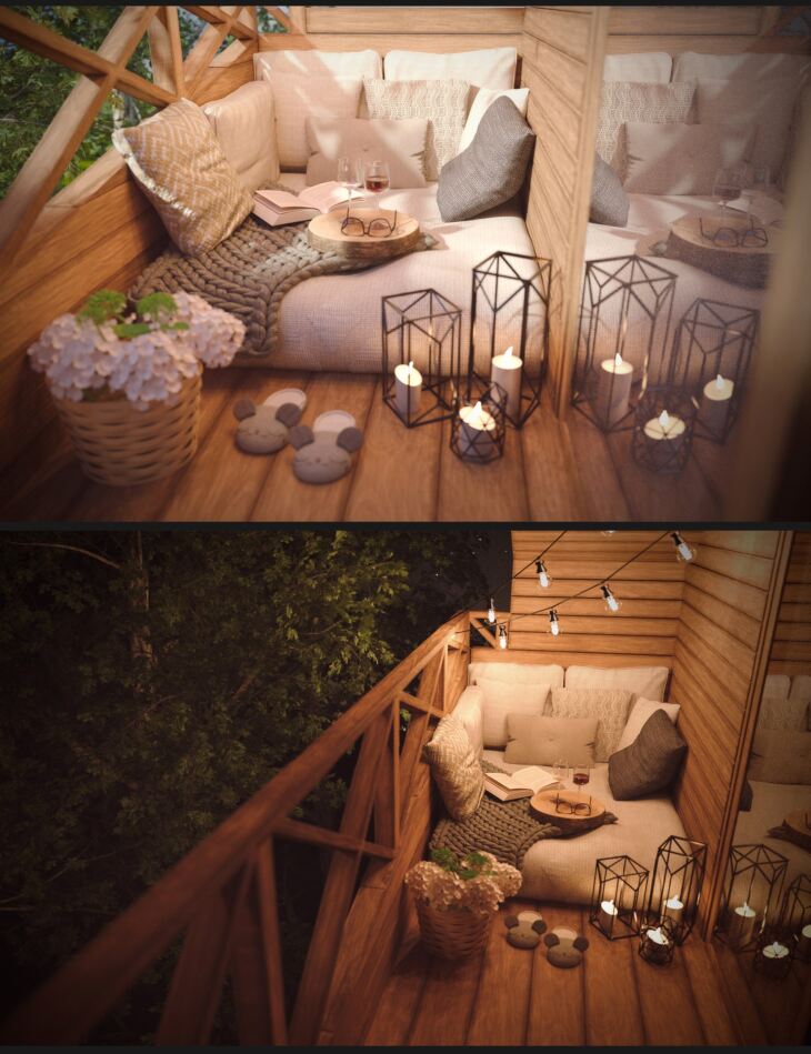 It contains a lovely wooden balcony with a sofa nook, several props, and a high res broadleaf tree, which all come ready to render in Iray. The preload scene also features materials, lights, and camera angles.