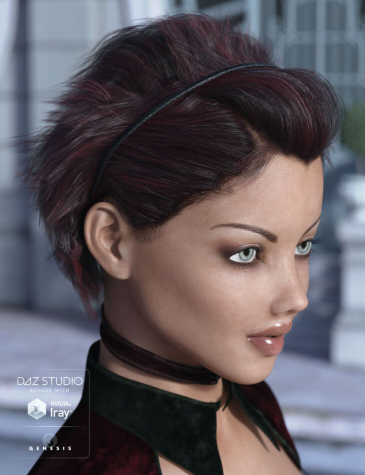 Soleil Hair is a morphing, polygonal model of a short layered style in a headband. The hair is fitted for Genesis 2 & 3 Female(s) (.DUF) with auto-conforming custom morphs for Daz Original characters.