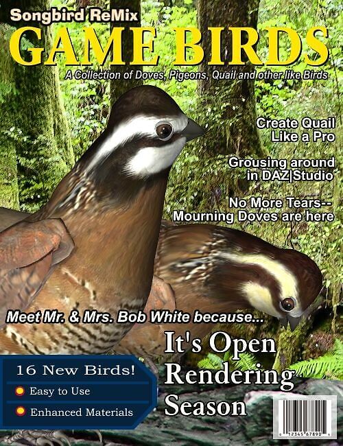 Songbird ReMix Gamebirds adds Doves, Pigeons, Quail, Grouse and many other Upland Game birds to the Songbird ReMix library. Using the powerful morphs from the Songbird ReMix .cr2, texture maps and versatile conforming crests and tails, the represented birds are portrayed more accurately and with stronger degree of realism. Included are 11 species of birds, some with male and female markings.
