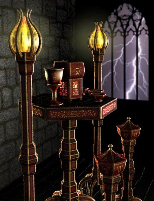 Everything your sorcerer or sorceress needs to brew potions and cast spells-- table, brazier and potion bowl, potion ingredients, a chalice, lamps, incense burners, and a crystal wand.