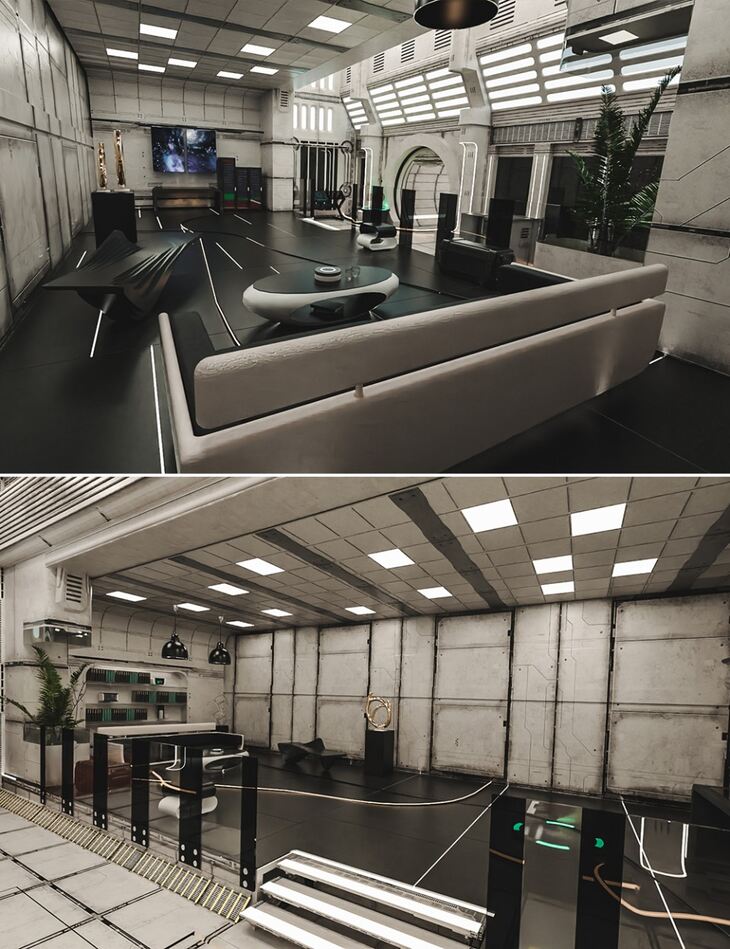 A Space Living Room with a very nice, clean interior space design. Includes several various types of props suited for the environment.