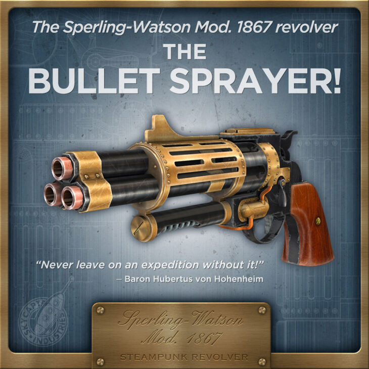 The Sperling-Watson Mod. 1867 steampunk revolver is a trustworthy companion for all your protective needs! Whether you're exploring the swamps on red planet Mars or the vast catacombs of the Patriqzuela temple city, the Sperling-Watson is there for you. Nicknamed "The Bullet Sprayer" by its inventor, Sir Reginald Sperling-Watson, this fine quality weapon will literally spray bullets when the trigger is pulled (and the steam pressure is sufficiently high).