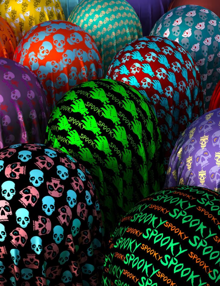 Spooky Fabric Fabric Iray Shaders is ideal for all your Halloween and horror scenes. It features various unique patterns of skulls and bloody hands in luxurious silk fabric. These unique designs match well with various colors.