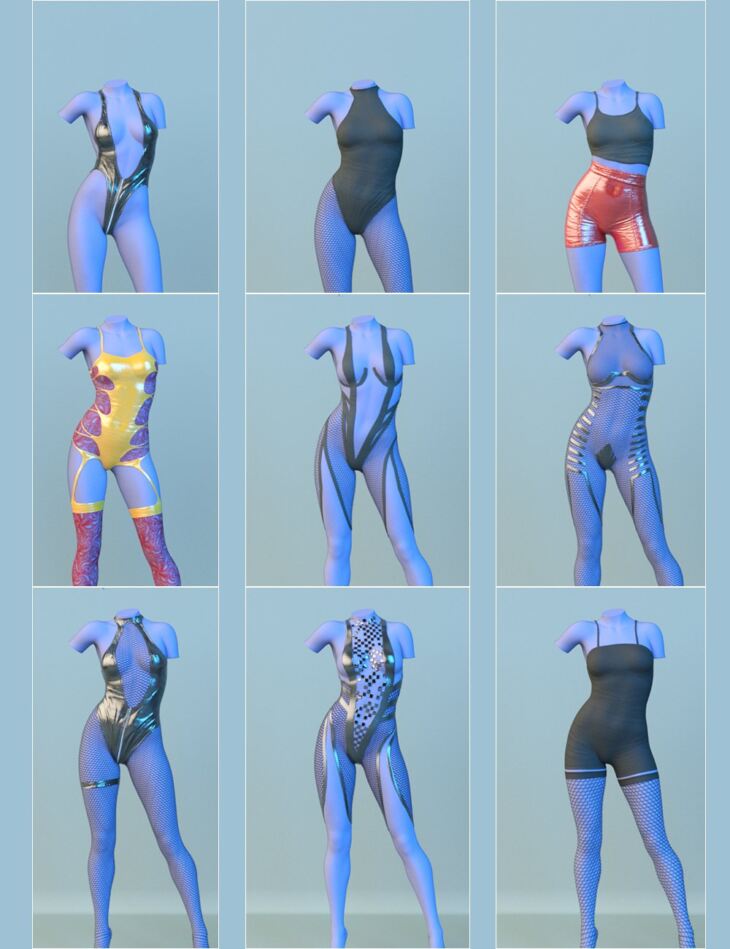 The SPR Attractive Underwear Collection for Genesis 8.1 Female Bundle contains a variety of imaginative garments, each with three materials: leather, smooth, and cloth.