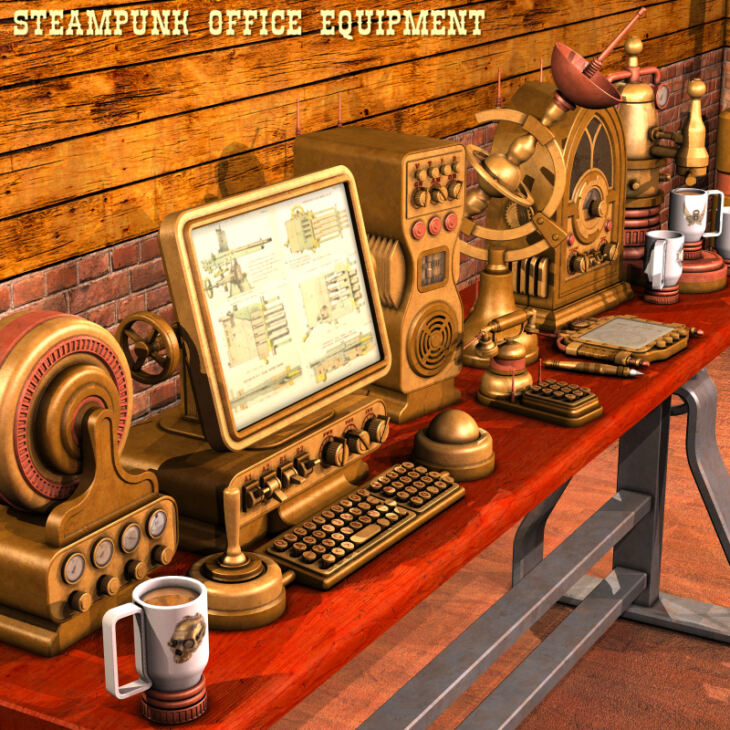 Steampunk-themed equipment to furnish an office or to help fill out any steampunk scene.