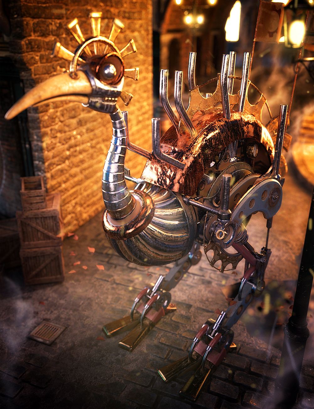 A fully rigged steampunk robot ostrich for your fantasy sci fi renders. Full DAZ Studio support, and Basic Poser Support as Standard.