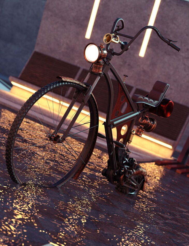 The Steampunk Penny-farthing Bike, as the name implies, is a detailed bike inspired by the iconic penny-farthing but re-imagined with Steampunk design elements.