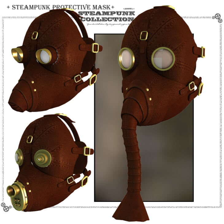 This product contains a detailed model of a Steam Punk style protective mask. The mask comes with three smartprop fits for M4, V4 and Doctor Pitterbill. The three different eye pieces and three different respirators are all smartprops for easy use. The Mask and respirators comes with three different leather materials.