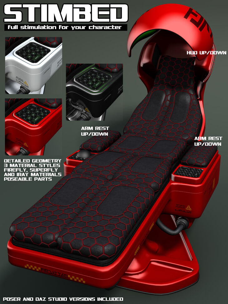 Poseable head hud and armrests. Three material styles included for Poser Firefly & Superfly and Daz Studio Nvidia Iray.
