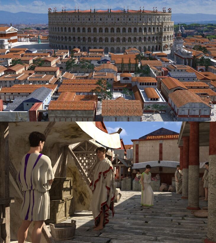 Welcome to Rome "Gratam Romam". Take a walk through the streets of the Monti district filled with tight alleyways and market stalls. In the distance you can see the Colosseum and the Temple of Venus as well as the Arch of Constantine.