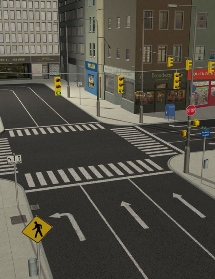 You load the pieces you need and apply preset poses to link them together. There are 4 street units, 5 building facades and a city block, which can fit together in many different ways.