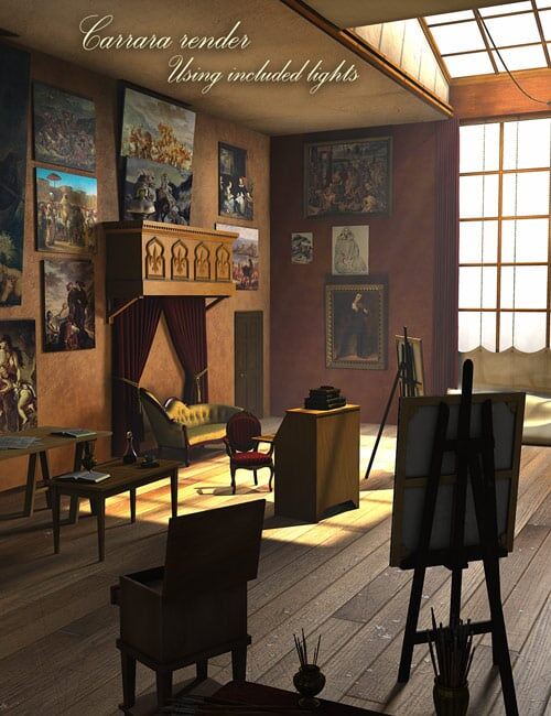 Included are 5 articulated figures including the studio, furnishings and poseable male and female busts. Also included are dozens of props such as books, brushes, frames, vases and morphing curtains.