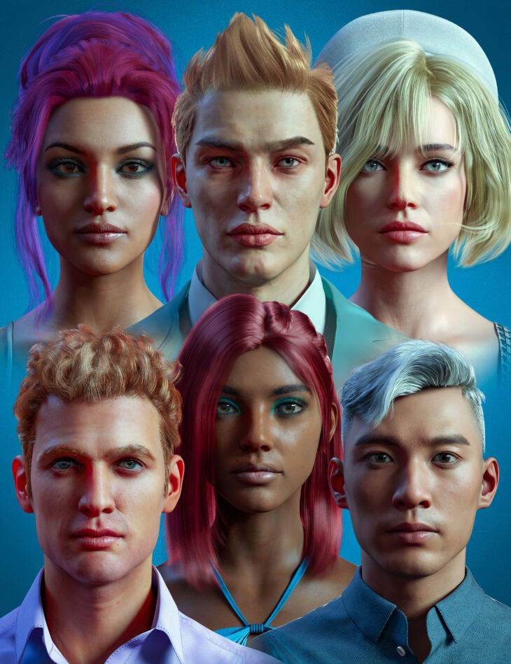 Find a hairstyle for any scene with the Stylish Hair Mega Bundle. It comes with 4 female hairstyles, 6 for your male characters, and a variety of color options for each. From contemporary, sci-fi, and fantasy settings, you'll have a style for it all!