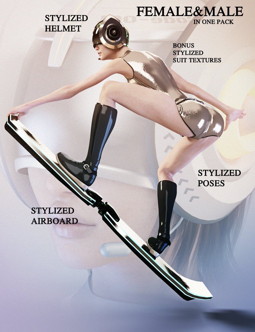 Stylized Helmet, Airboard and Poses with Bonus Suit Textures is a set includes detailly designed helmet-air board have 4 completely different style materials and active, creatively dynamic, acrobatic, stylish, artistic, well-balanced poses for all Genesis 3 Female(s) and Genesis 8 Female(s), Genesis 3 Male(s) and Genesis 8 Male(s).