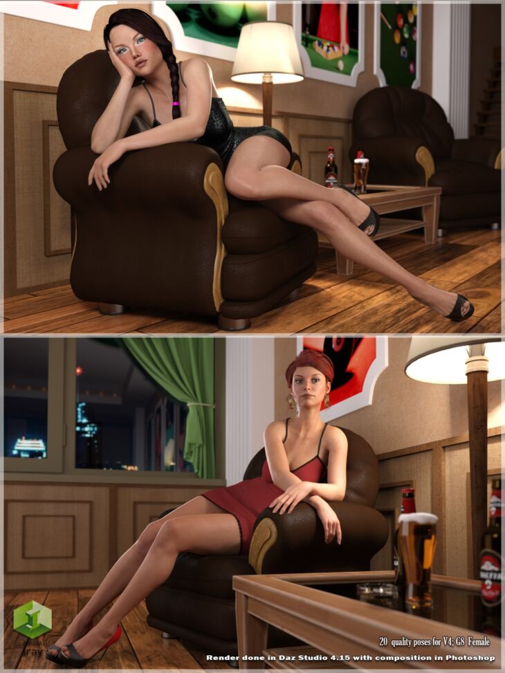 "STZ In the armchair 2" - it's a 20 unique quality poses collection for V4 and Genesis 8 Female.