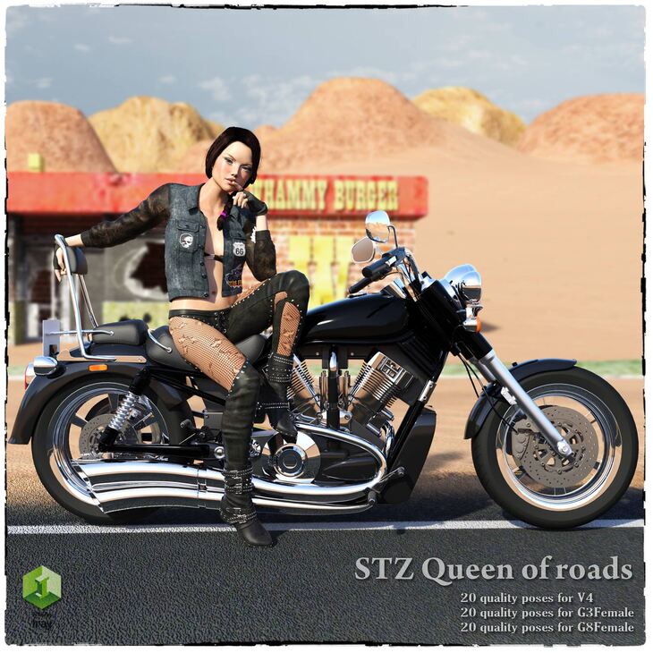 STZ Queen of Roads is a 24 unique quality poses collection for Victoria 4, Genesis 3 Females and Genesis 8 Females.