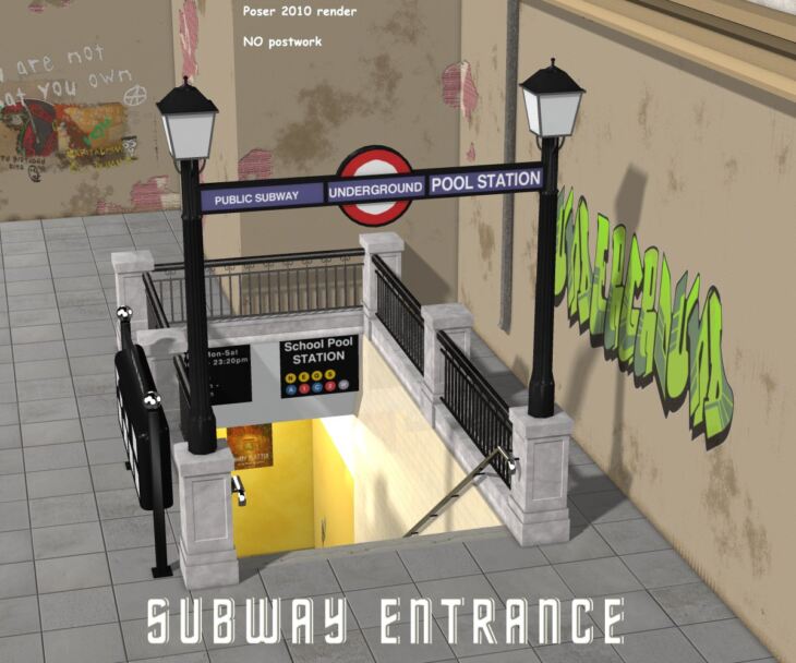 A complete subway entrace scene, detailed exterior and textured underground corridor, that comes with all props and Raytrace lightning.