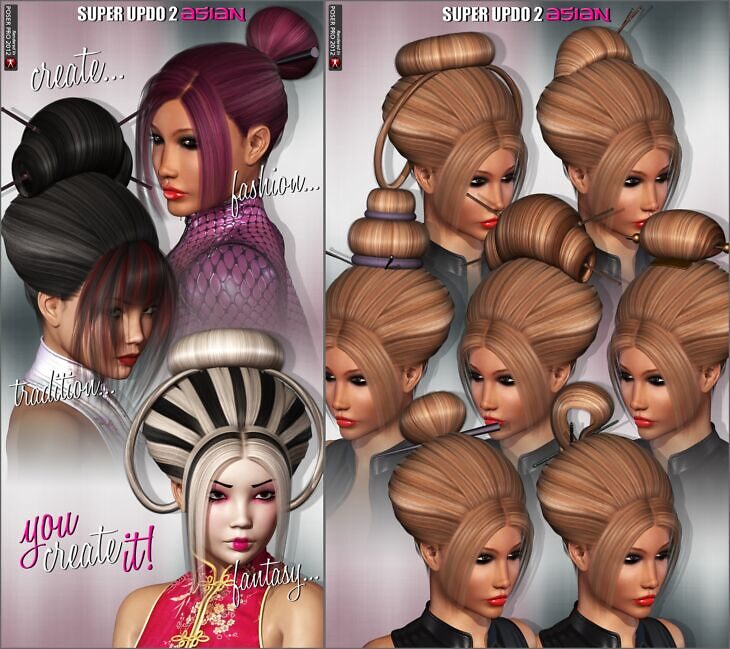 The Super Updo Hair 2 - Asian package is the ultimate package to create asian updo hairstyles! From fashion looks, to traditional asian looks and fantasy asian looks, this is the pack that brings you endless possibilities.