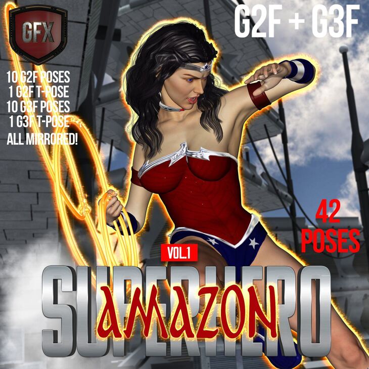 SuperHero Amazon is a set of poses for G2F & G3F plus Olympia Morph from Daz3d. Daz Studio Only.