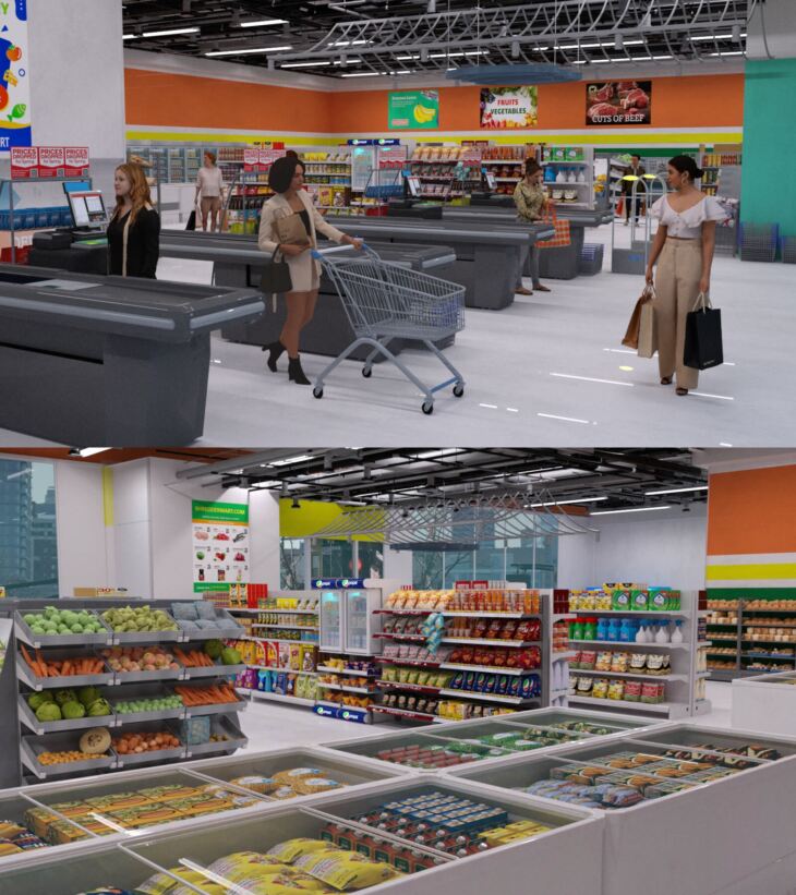 This is your typical supermarket filled with all types of food including fruit, vegetables, meats, breads, dairy, sweets, seafood and frozen goods. It is fitted with checkout counters, ATM's and also comes with a trolley and separate goods for filling the trolley.