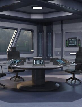Supervillain Conference Room features rugged cement walls, holographic globe, movable doors, desk, and chairs.
