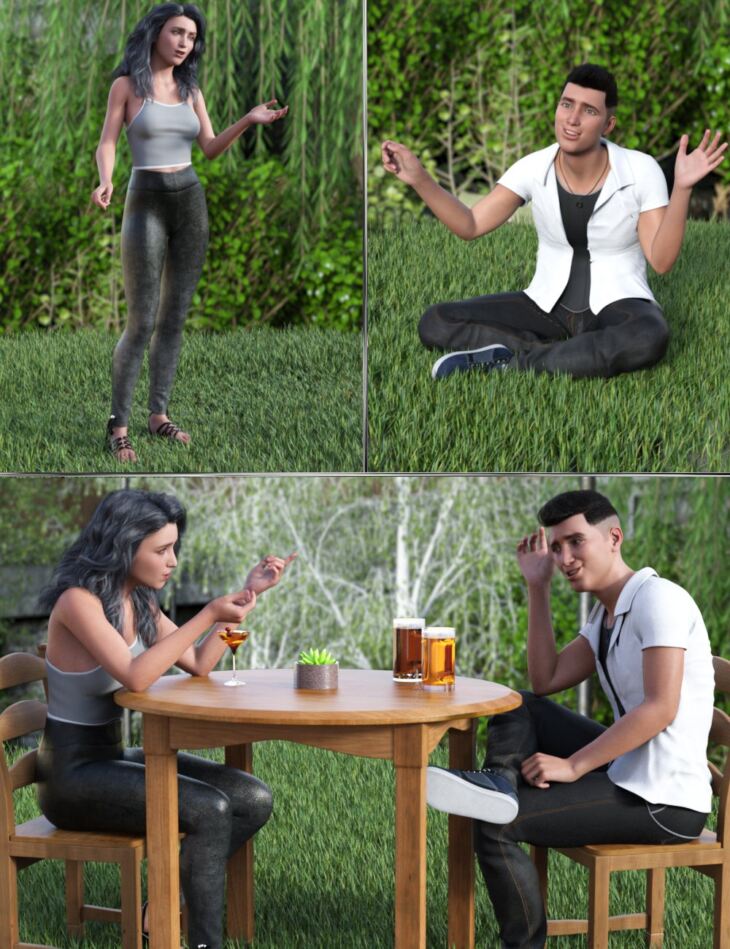 Talking to You Poses and Expressions for Genesis 8.1 contains 20 original poses (mirror, upper and lower body presets included for each pose) plus 12 face expressions (6 for Genesis 8.1 Female and 6 for Genesis 8.1 Male).
