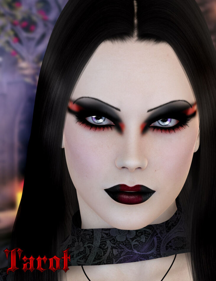Tarot is a bewitching new gothic witch character for V4. She comes with unique Magic and Tarot inspired tattoos, 3 complete sets of MAT Poses, AO, No AO and SSS MATs for Poser 9+.