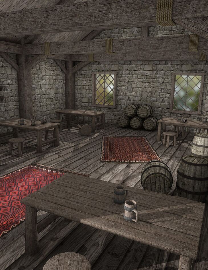 A detailed medieval style tavern dining room, with tables, stools, mugs, barrels, and floor rugs.