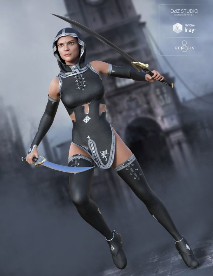 Templar Huntress for Genesis 8 Female(s) is a new fantasy outfit for Genesis 8 female, much in the theme of assassin' creed. Comes with a dress, leg length boots and arm length arm covers a hood and swords for both left and right hands plus matching panties.
