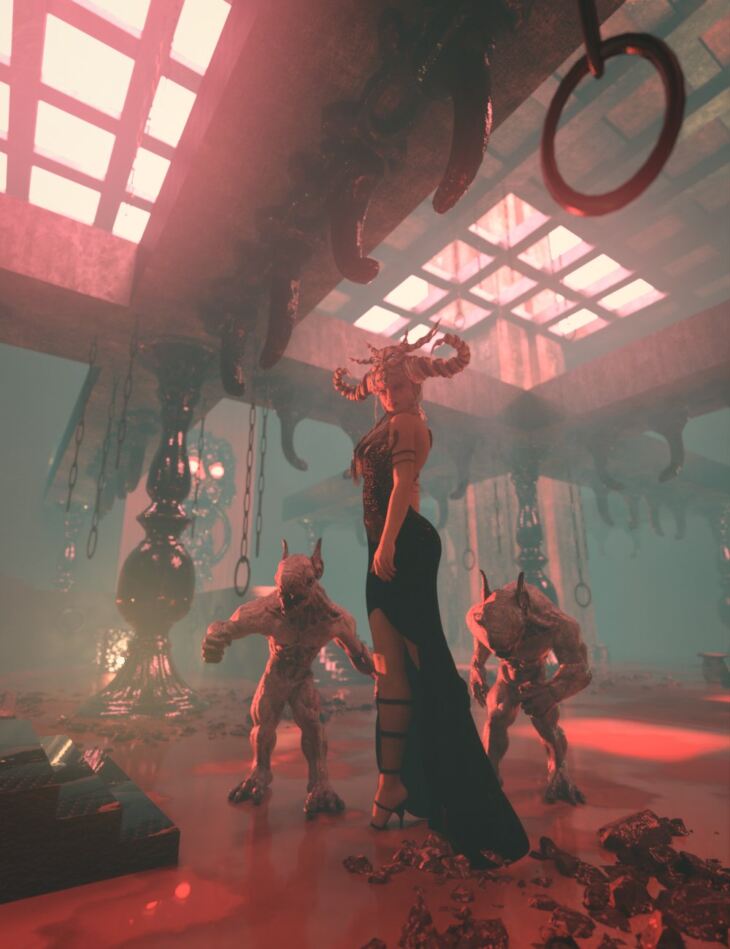 Feel the horror, smell rotten, and embrace the darkness... Temple of the Damned is a terrifying scenery for Daz Studio with lots of chains, pillars, and blood puddles with bone remains.