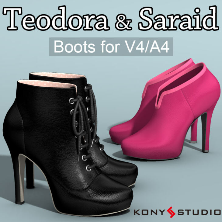 There are 2 conforming boots, "Teodora Boots " & "Saraid Boots" for Daz3d Victoria 4 & Aiko 4 in this product.