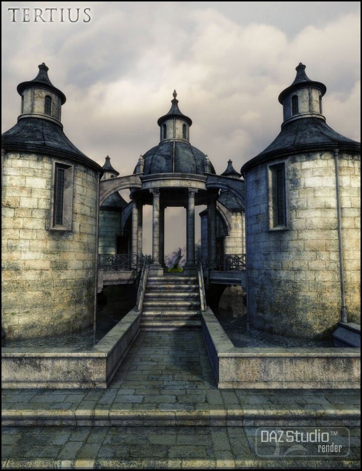 Tertius is a uniquely designed 3D environment set featuring an elevated center section that leads to a series of out-buildings set into an elevated ground with water running underneath the buildings.