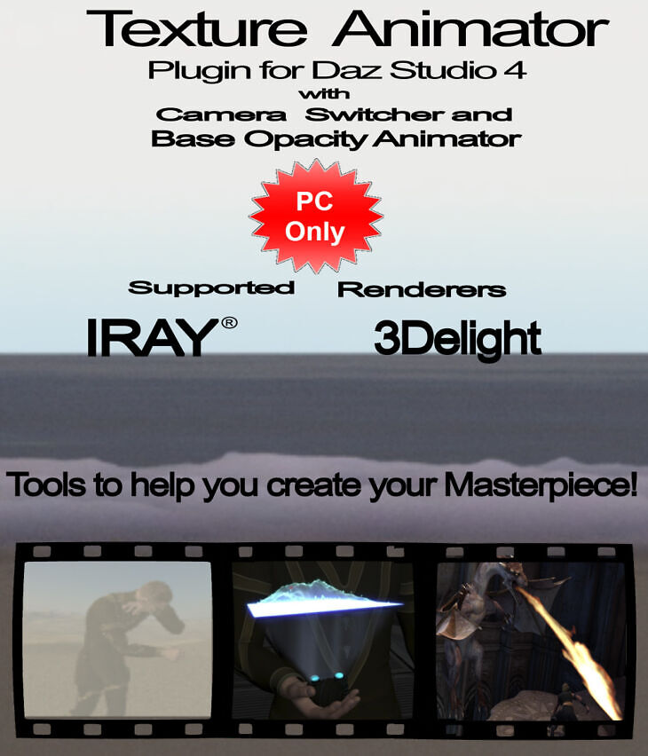 Texture Animator is a plugin for Daz Studio 4 which supports the new IRAY render engine as well as 3Delight.