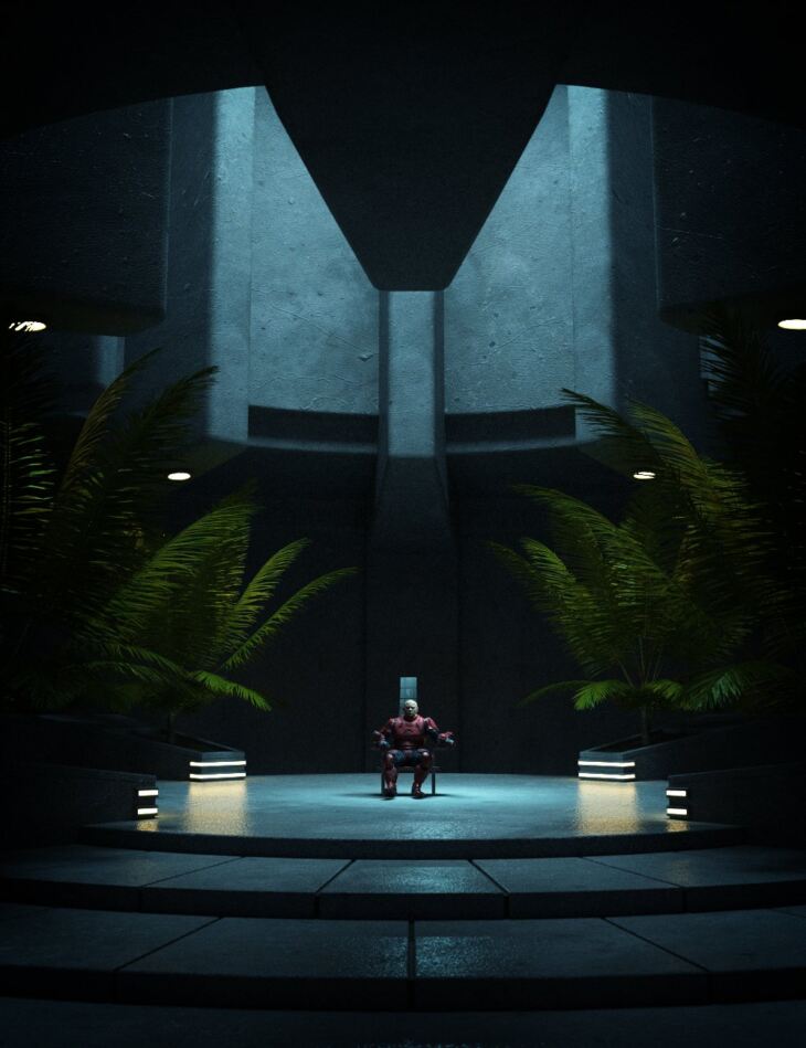 The Baron's Round is a large-scale, easy-to-use set that depicts a large, dark, foreboding chamber centered around a tall polished metal chair and mysterious floating table, lit from above by a pre-set skylight panel.