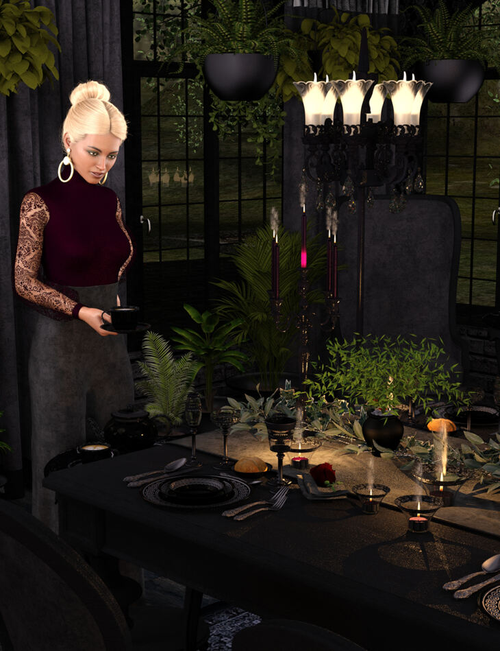 Here is the dining room for the Black House. 75 placed and zeroed props are here to allow you to create a dark and chic dining scene. You will also get shaders and presets to load the whole scene or only the dining room assets.