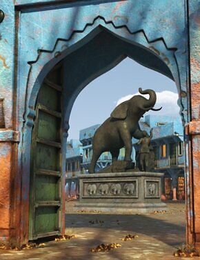 The set contains a Gate House, family home, family home with a tea shop, building with three shops, archway with a hill path, tree shrine, trader's cart, street lamp, dirt mound, and ground plane. This is a kit and not a complete set, so you simply load up what you want, position them to form your scene, and render. It is possible to create many different looking sets from the props.