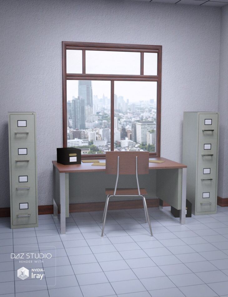 The Filing Room is an interior scene with cabinet, chair, desk, box, and folder props. All props load separately, full scene Preload included.