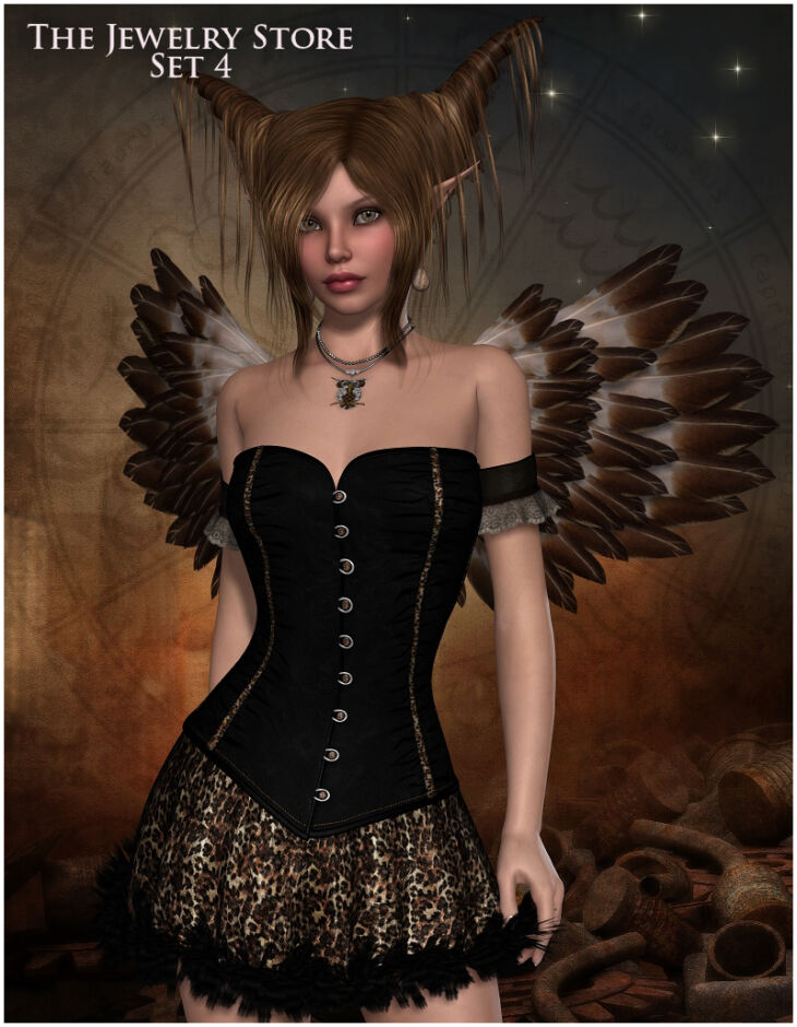 The necklace contains V4's Morphs +, A4, G4, S4, and Elite fits including morphs for the charm. The earrings are smart props as well as the wings!