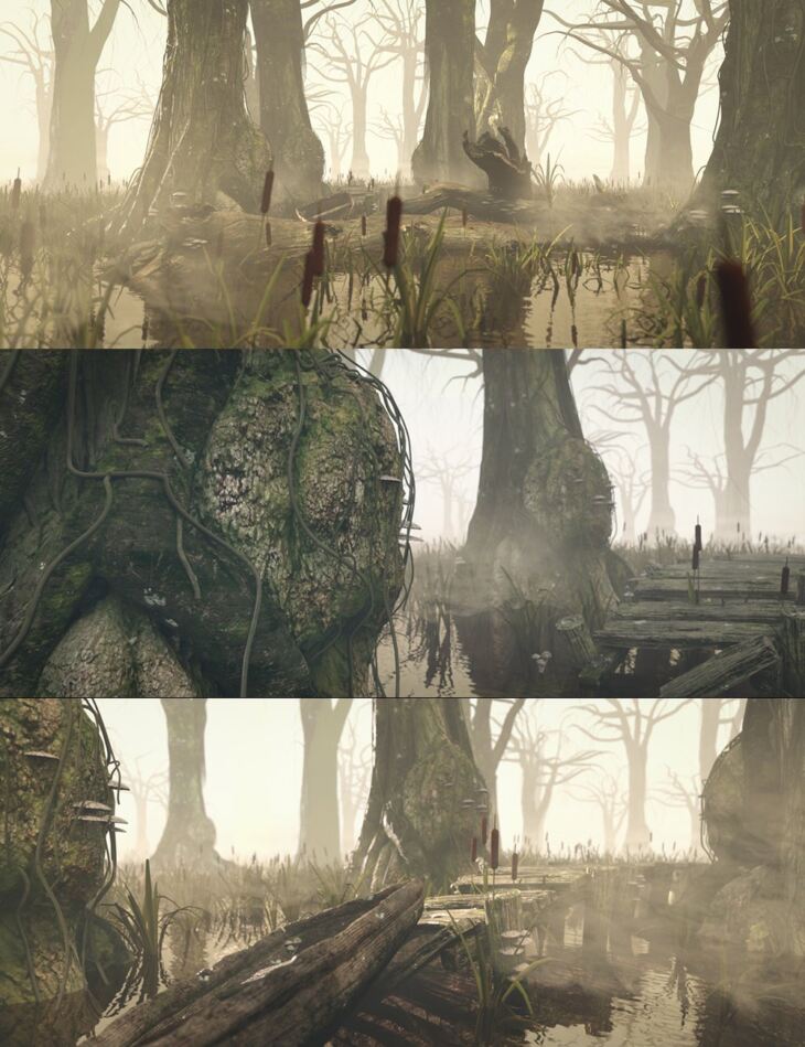 The Misty Swamp is a mysterious and foggy environment full of trees, vines, mushrooms, and grass.