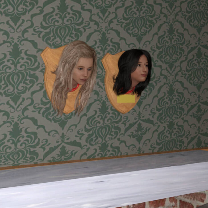 Comes with props for a set for a twisted trophy room, and poses for the genesis 8 figure, both Male and Female.