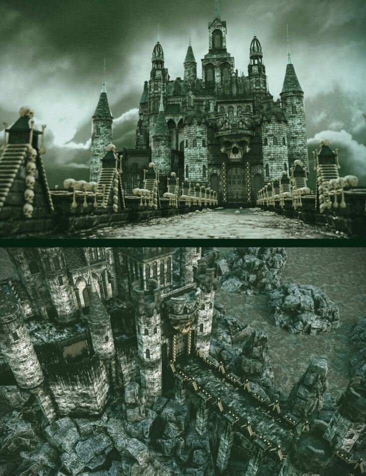The Skull Castle is a realistic, dark fantasy castle built with highly-detailed textures for your rendered scenes. It includes the rocky ground, bridge, castle building, skulls, and bone debris, which are ready to render in Iray. The preload scene also features materials and camera angles.