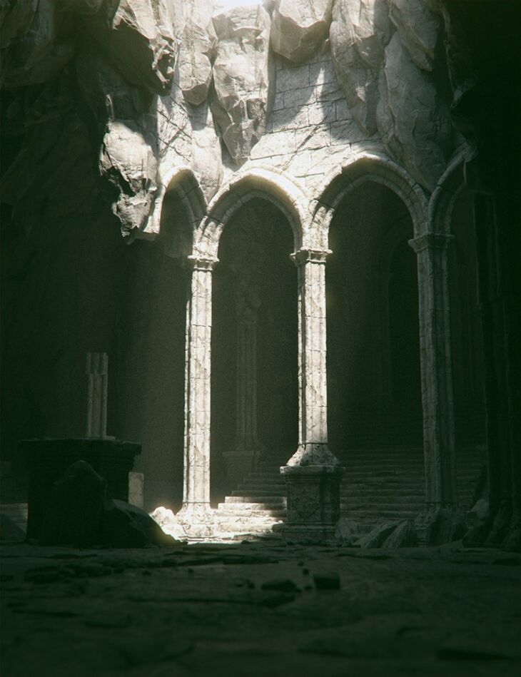 Hidden in a dark cave, The Temple Below is a gothic fantasy scene.