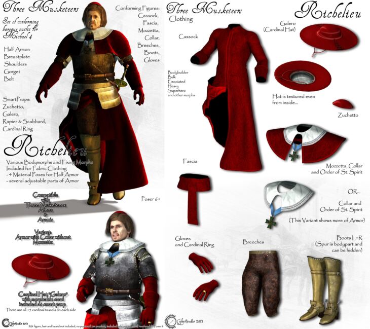 Set of conforming clothing for M4 inspired by XVII th century male outfit from legendary Three Musketeers Novel. The third part is musketeers' arch-enemy - Cardinal Richelieu.