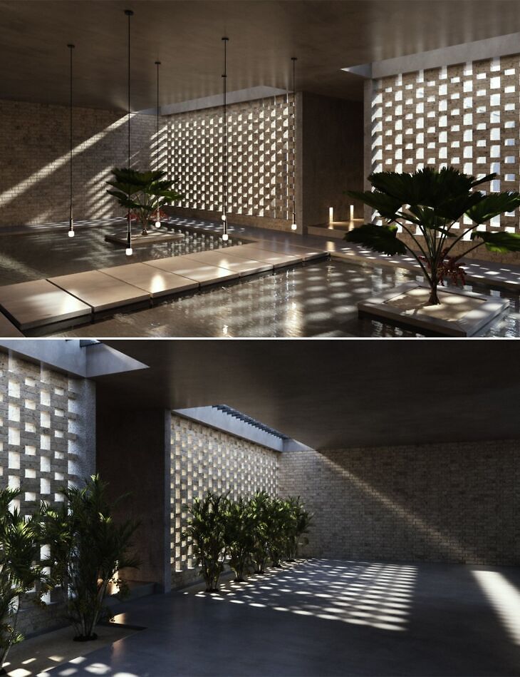 The ornate brick building features intricate architectural details, that allow sunligh to stream in, casting a dynamic interplay of shadows and highlights across the interior.