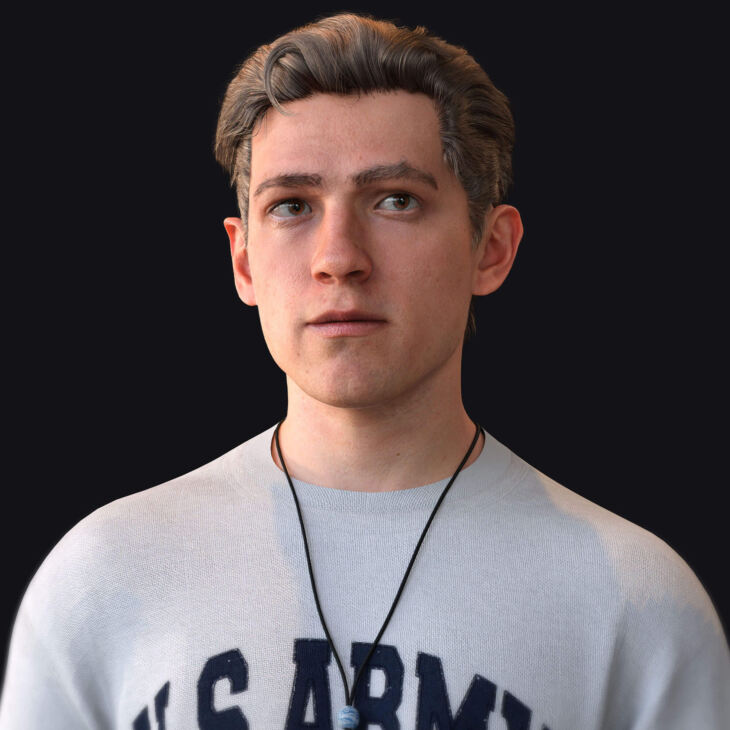 Tom Holland is a 3D Character for Genesis 8.1 Male with photorealistic skin and detailed displacement maps, achieving a striking likeness to the actor, while also blending well with other Daz Studio figures for the creation of unique characters.