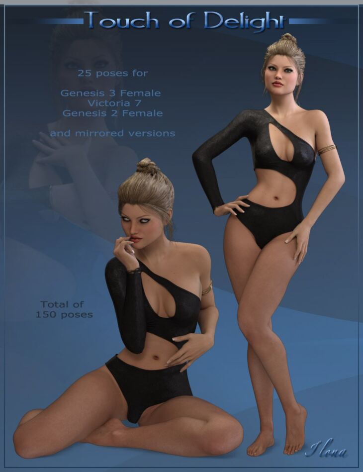 A beautiful and sensual collection of poses for Genesis 3 Female, Genesis 2 Female and also an optimized version for Victoria 7, all with mirrored versions. Special attention to hands posing, eyes positioning and all details that make poses natural and realistic.