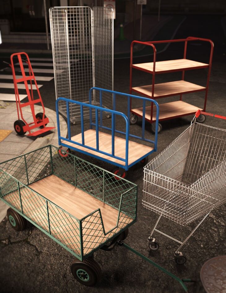 These carefully designed models, including crate trolleys, garden carts, and more, are essential tools for storytellers. Whether it's a bustling market, a warehouse in motion, or a commercial setting, these assets seamlessly integrate into your Daz Studio environment.
