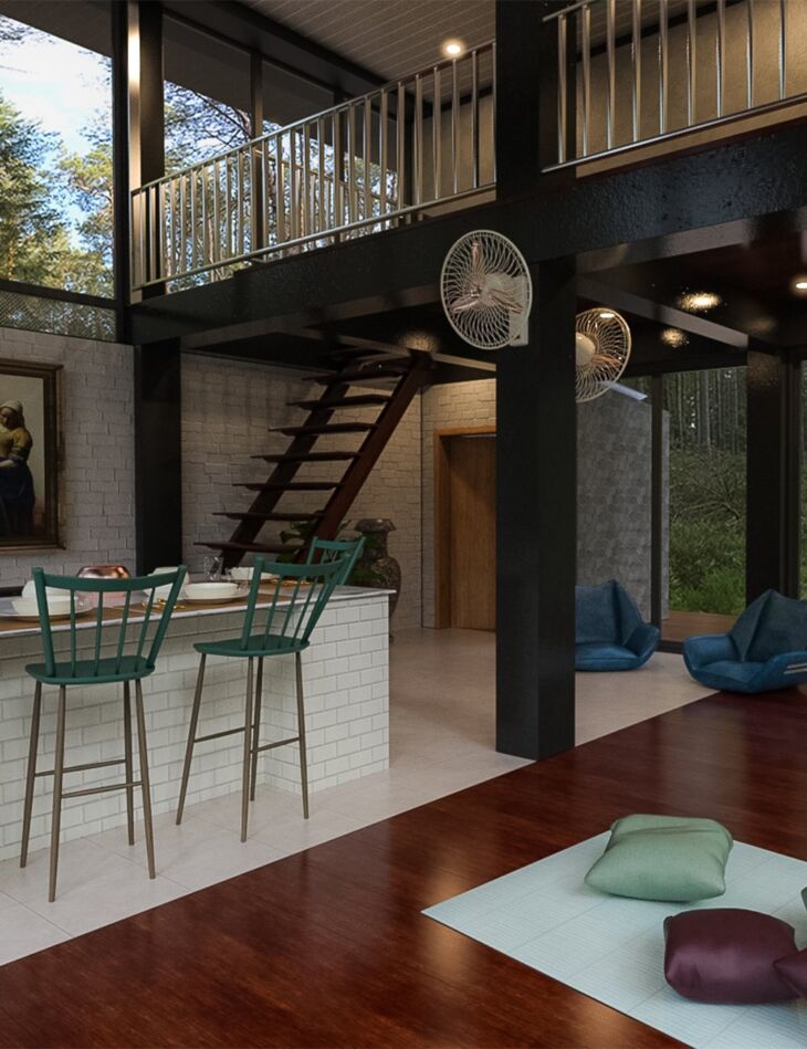 Introducing Tropical Chalet, a loft-style cottage that is open so the air can naturally come in and heat won't be as much. The design is a mixture of wood, marble, and concrete. It's more of an industrial take on a cottage.