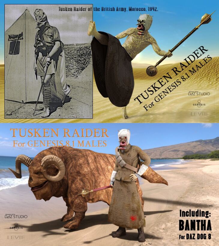 The Package comes with Iray material preset, genitalia, eyelashes, Tusken Raider Mask, outfit, belt, boots, weapons -- a Gaffi Stick -- the traditional melee weapon of the Tusken Raiders, and attachments like a big Tusken Raider alarming Horn; and also a Bantha Fur, and Horns.