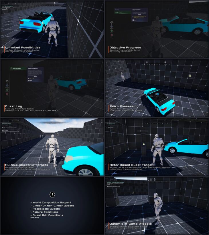 The whole system will be working dynamically after you create your quest in the Data Table. This system has a save game feature (quest data only) and it will be saving&loading all of the progress for a quest. Compass, dynamic markers, quest log, and a lot more are included in this pack.